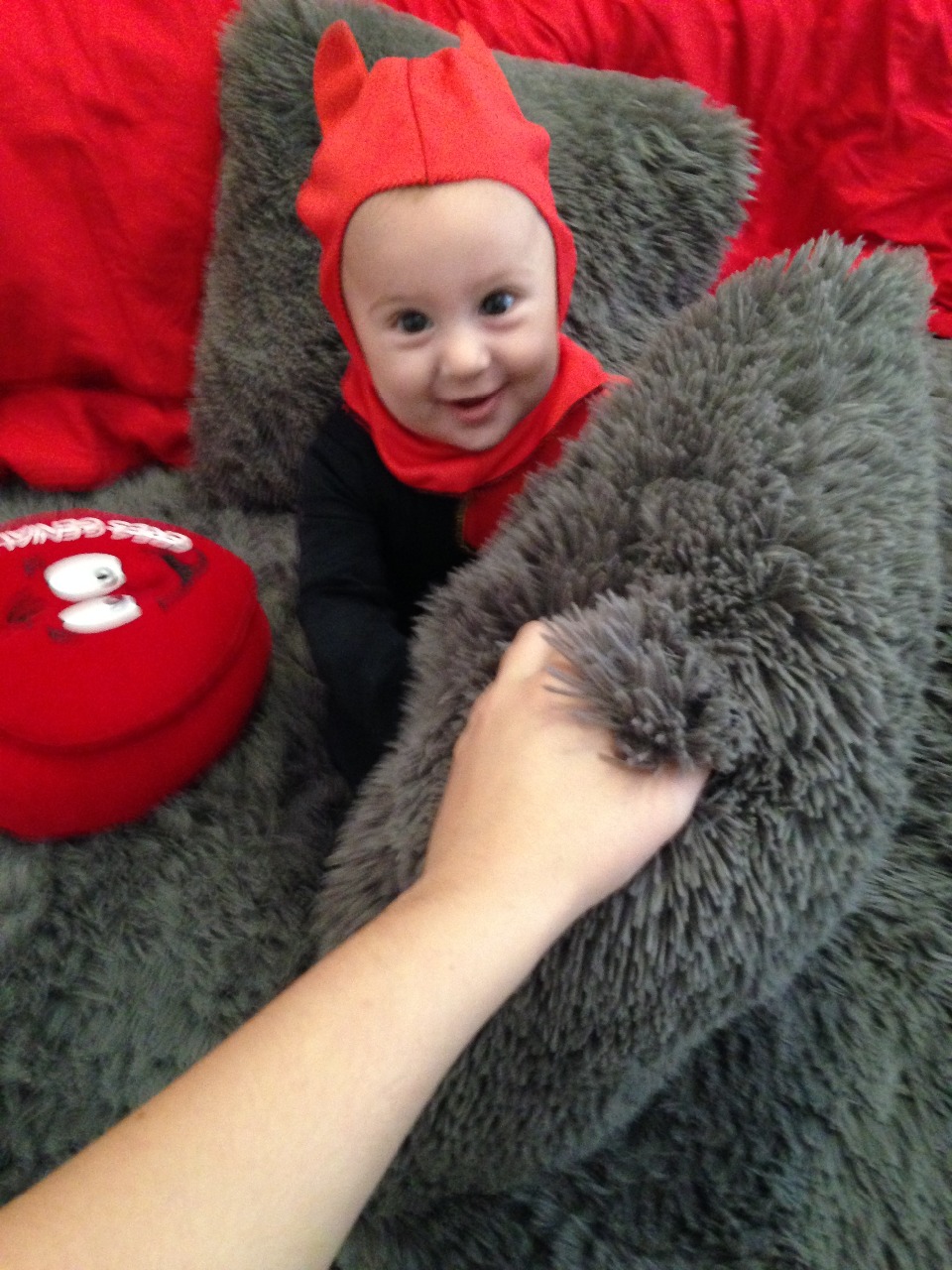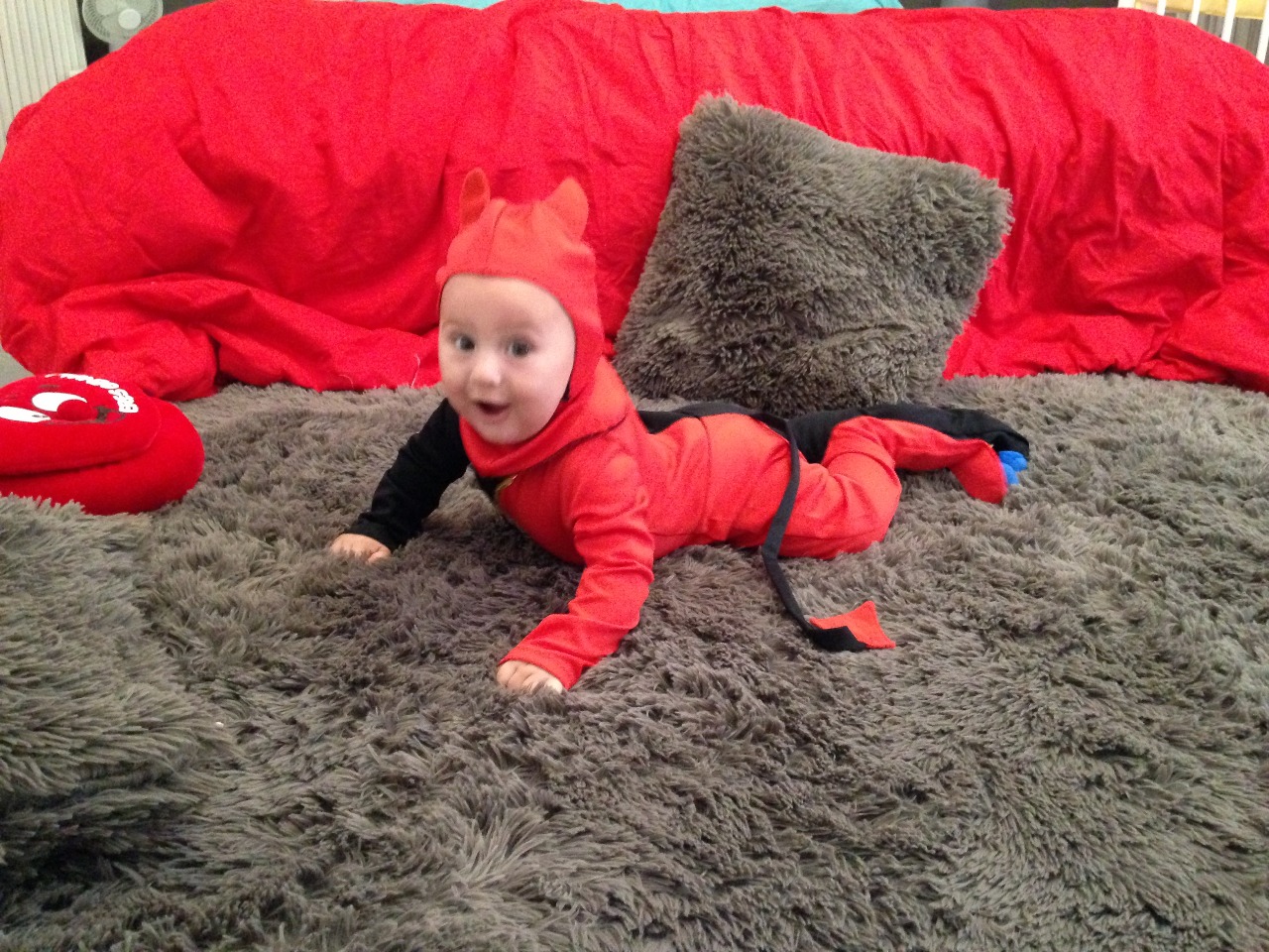 Bueno el día de Halloween decidí vestirlo de demonio ya que el realmente lo es... Es un niño muy extrovertido, núnca se queda en el mismo sitio más de 10 minútos, nos pega, nos araña, nos tira del pelo sin parar... Bueno digamos que el disfraz le pega un monton. Además que él se sentía muy comodo en él. Yo creo que debemos disfrazar a nuestros bebes el día de Halloween, en carnaval, cuando sea, así ellos también se ven de otra manera y yo creo que les gusta.